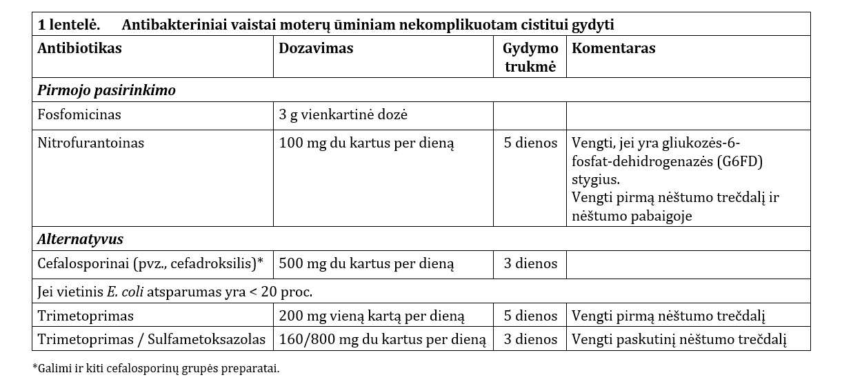 Nekomplikuotas cistitas gali praeiti savaime, vis dėlto dažniausiai jis gydomas antibiotikais (1 lentelė) [1, 6]. Jei simptomai lengvi arba vidutinio sunkumo, kaip alternatyva antibakteriniam gydymui gali būti skiriamas simptominis gydymas nesteroidiniais vaistais nuo uždegimo (pvz., ibuprofenas).