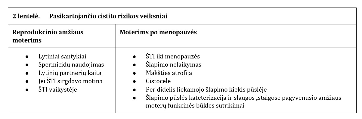 Pasikartojantis cistitas yra dažnas moterų negalavimas, susijęs su gyvenimo kokybės pablogėjimu [11]. Tyrimų duomenimis, apie 50–60 proc. moterų bent vieną kartą gyvenime serga ūminiu cistitu, o 30–40 proc. moterų nustatomas pasikartojantis cistitas [1, 11, 12]. Pasikartojančio cistito rizikos veiksniai priklauso nuo moters amžiaus (2 lentelė) [1, 12].